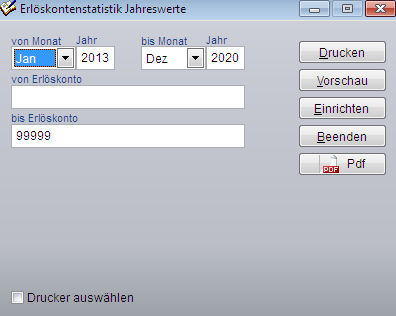 Neben der zeitlichen Eingrenzung (von – bis Monat/Jahr) können Sie durch Eingabe in den Feldern von und bis den Erlöskontenbereich festlegen, der gedruckt bzw. angezeigt werden soll.