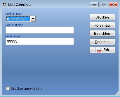 Die Auswahlmöglichkeiten für die Listen Zahnärzte, Techniker und Lieferanten sind identisch. Die Sortierung erfolgt nach Kunden-Nummer, Kurzname oder Name.